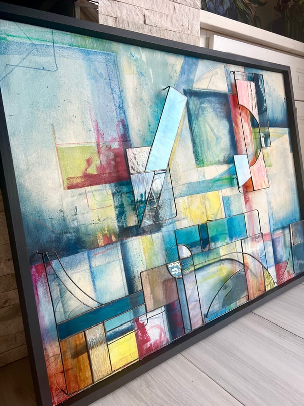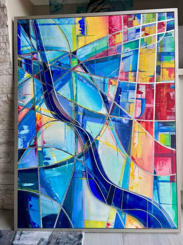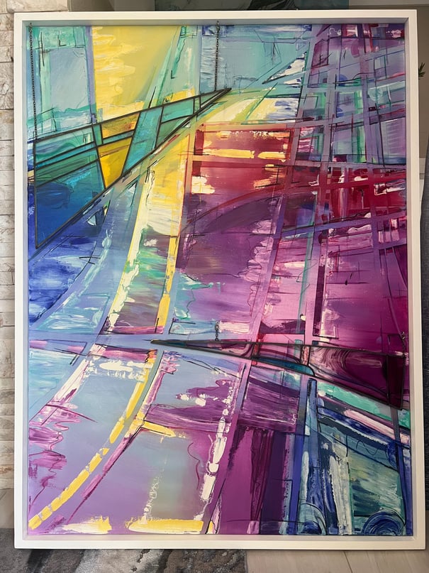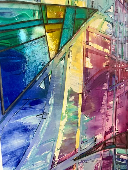 I love the shifting properties of glass, how it morphs at every angle and changes throughout the day depending on the waning sunlight or angle of view. Glass overlays highlight abstract shapes and are a nod to the flux and form of shifting reflections.