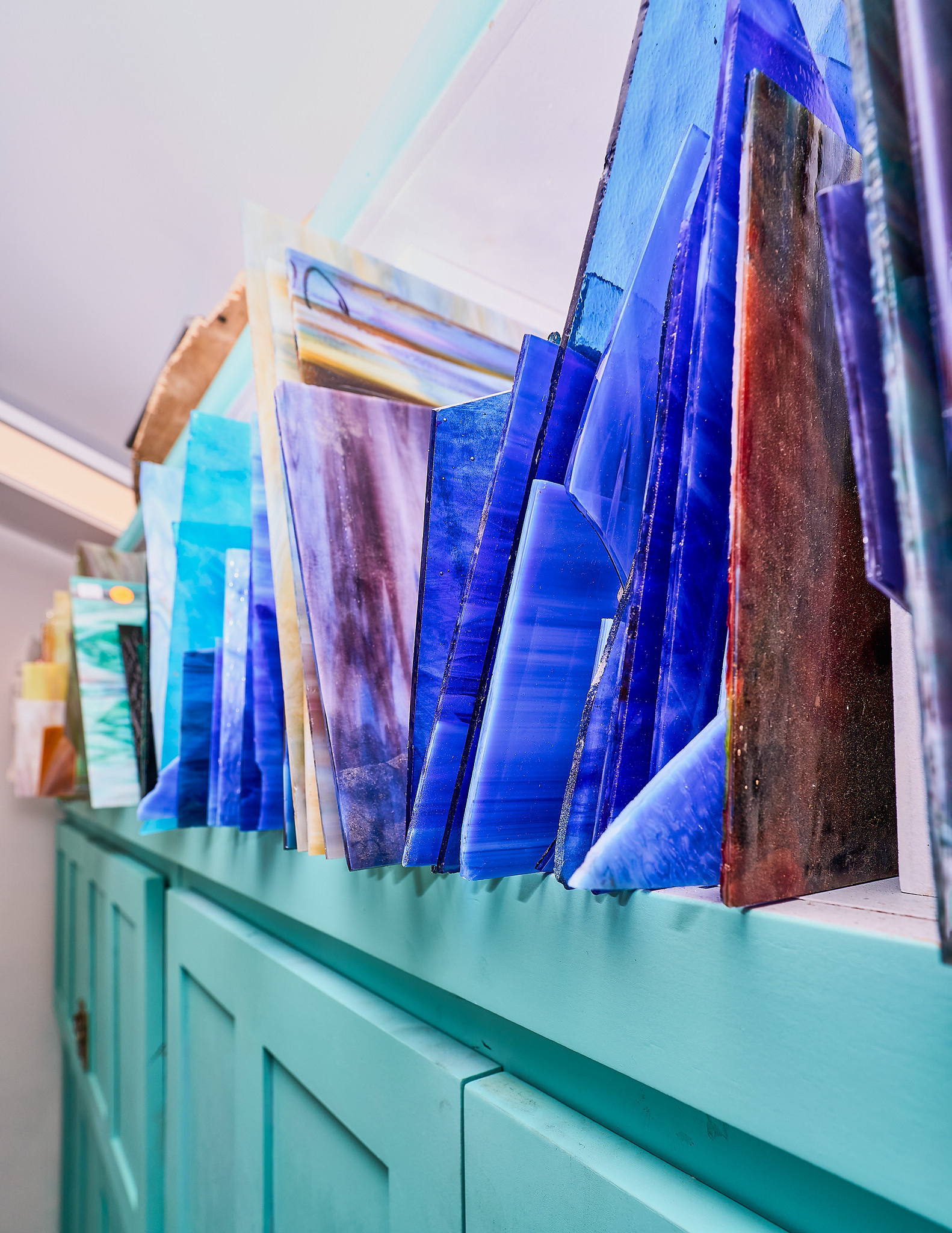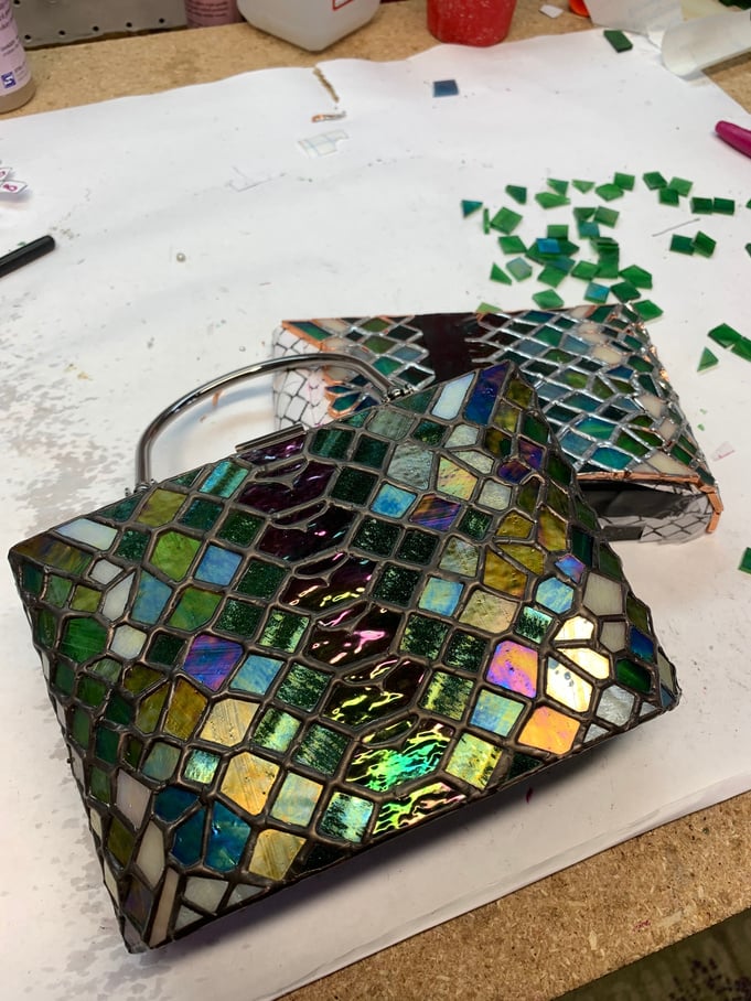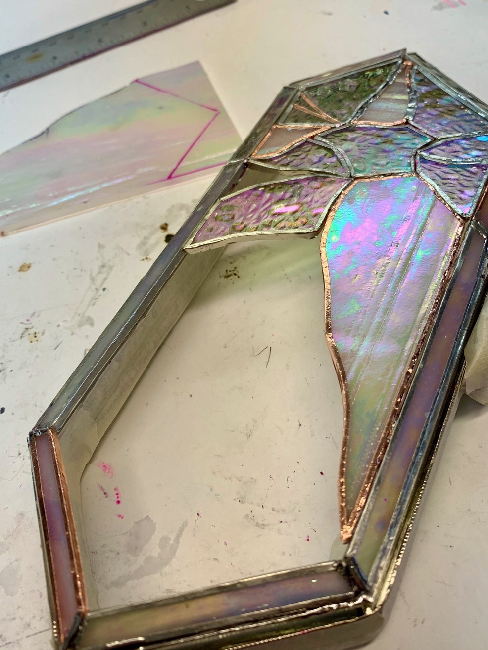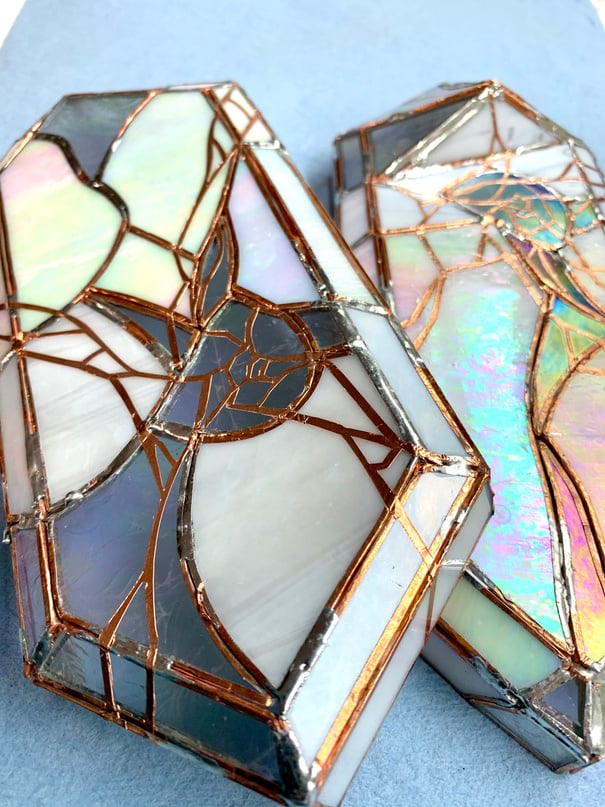 I work with modern iridescent and opaque glass although my preference is to build with reclaimed and vintage or mouth blown sheets. The glass itself carries a history and story before it is reimagined.